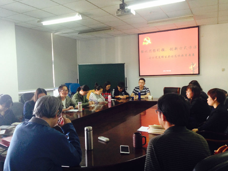 接下来,会计系党员师生就高校思政建设问题进行了共同学习和交流。学生党支部书记田秋月同学首先发言指出,高校教育的改善需要师生双方共同努力,不仅需要教师加强责任带头意识,更需要同学们有学习、奋进和开拓的意识。对于“我们想要成为怎样的人”、“我们要做些什么努力”学生党员更应该多一些思考与行动。其他学生党员主要围绕日常专业学习、实习与考证时间上的矛盾,个人遇到的问题、发现的普遍现象和一些思考等,向教师党员进行请教与交流。其中,学生党员倪子薇围绕师生关系发言,表示现在师生关系可以更进一步,师生可以共同参加一些文体活动以增进师生感情;学生党员左晓萌以天弘基金破万亿为切入点,提出高校众创空间对学生来说是很好的发展机会,学生应该去挖掘想法,勇于实践;学生党员徐静谈到自己很难把握学习与实习的平衡点,面对日后工作的选择存在诸多迷茫,希望老师可以提供更多的指导与帮助。