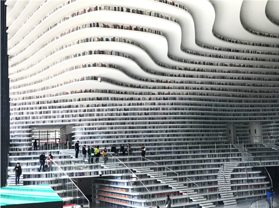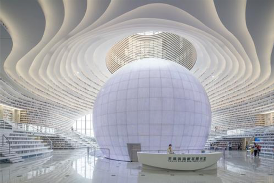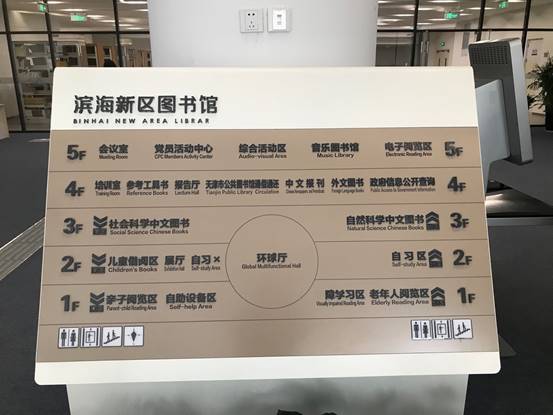 根据讲解员的介绍得知,这座图书馆是由荷兰MVRDV建筑设计事务所与天津市城市规划设计研究院建筑分院合作设计,2017年10月投入使用。大厅中央的球体是可容纳近百人的多功能报告厅;球体表面有44万个LED灯;可显示多种图案和文字。东门外的玻璃幕墙是仿眼睛形状,这个球体就是眼睛里的眼球,凸显了“滨海之眼”的建筑构思。大球周围的低层书架中的书是真书,高层书架是以冲孔铝板结合彩色印刷为基础打造出的“书山”造型,真假图书交相辉映,形象诠释了“书山有路勤为径”的精神境界,体现了“书籍是人类进步的阶梯”的文化内涵。