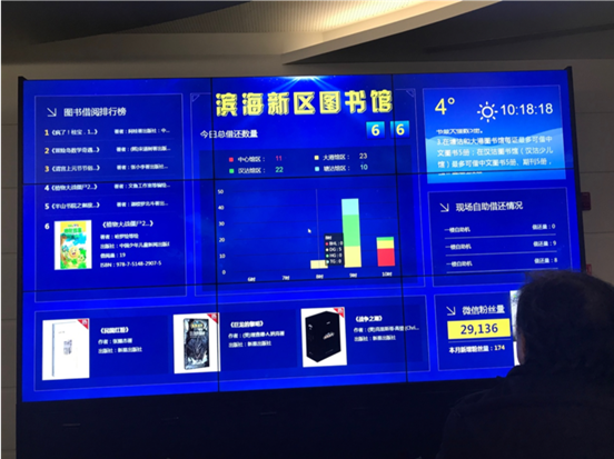 这是图书馆内的信息显示屏,从中可以了解图书借阅排行榜、各馆区借还书数量、推荐新书等动态信息。