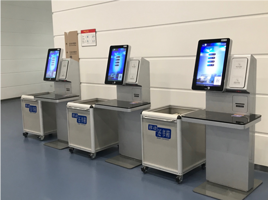 讲解员带领我们参观图书馆的各个楼层和阅览室。在馆内一至三楼,随处可以看到这样的自助借还书设备。