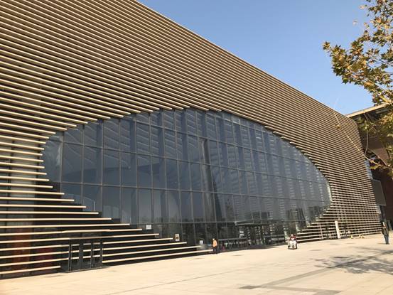 上午10点,到达图书馆的东门外广场,这是图书馆东外墙当中的梭形玻璃幕墙。