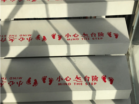 图书馆里的书山造型设计很气派,也很人性化。所有台阶边沿都印有这样的图案和文字,提醒读者小心台阶。