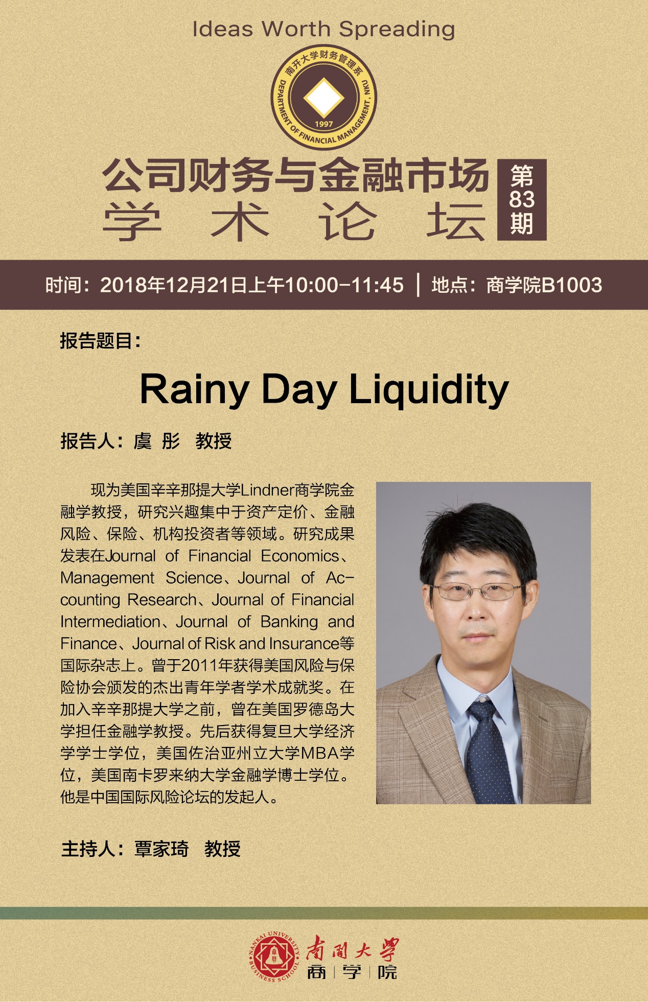 现为美国辛辛那提大学Lindnerwilliam威廉中文官网金融学教授,研究兴趣集中于资产定价、金融风险、保险、机构投资者等领域。研究成果发表在Journal of Financial Economics、Management Science、Journal of Accounting Research、Journal of Financial Intermediation、Journal of Banking and Finance、Journal of Risk and Insurance等国际顶尖杂志上。曾于2011年获得美国风险与保险协会颁发的杰出青年学者学术成就奖。在加入辛辛那提大学之前,曾在美国罗德岛大学担任金融学教授。先后获得复旦大学经济学学士学位,美国佐治亚州立大学MBA学位,美国南卡罗来纳大学金融学博士学位。他是中国国际风险论坛的发起人。