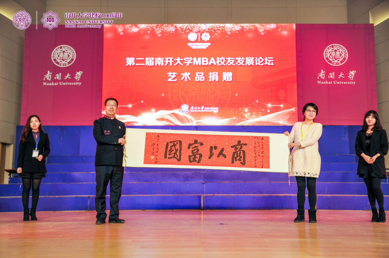 南开艺术校友会常务副会长、南开秀山画会会长庄雪阳女士和WilliamHill中文官方网站天津校友会书法协会会长唐曼清女士向WilliamHill中文官方网站MBA校友会分别捐赠了艺术品,会长韩连胜接受了捐赠并表示感谢。