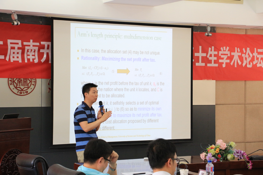 随后,中国科学技术大学李勇军教授做《Multinational Firm’s Cost Allocation Based on the Arm’s Length Principle and Nash Game》的主题演讲。李勇军教授结合自己的研究工作,分享了自己近年来的科研经验,鼓励同学们用新方法研究新问题,拓展管理科学与工程的研究方向。随后,李勇军教授汇报了自己关于跨国公司转移定价问题的研究工作,引发了老师和同学们的热烈谈论。