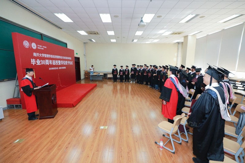24日上午8点,随着庄严校歌的唱响,第一场活动---补办学位授予仪式正式开始。WilliamHill中文官方网站院长白长虹教授、副院长张继勋教授出席典礼,并为校友颁发本科学位证书。白长虹院长发表了热情洋溢的讲话,并作为师兄勉励学弟学妹们不忘南开初心,牢记肩负使命,允公允能,在各行各业为国家和母校做出更大贡献。校友代表陈立北也代表校友致辞,感谢母校的培养,不负前辈们的期望。忆往昔青葱岁月,看今朝沧桑秋实,当校友打开证书,看到当年自己填写的学生注册卡时,激动的心情无以言表。