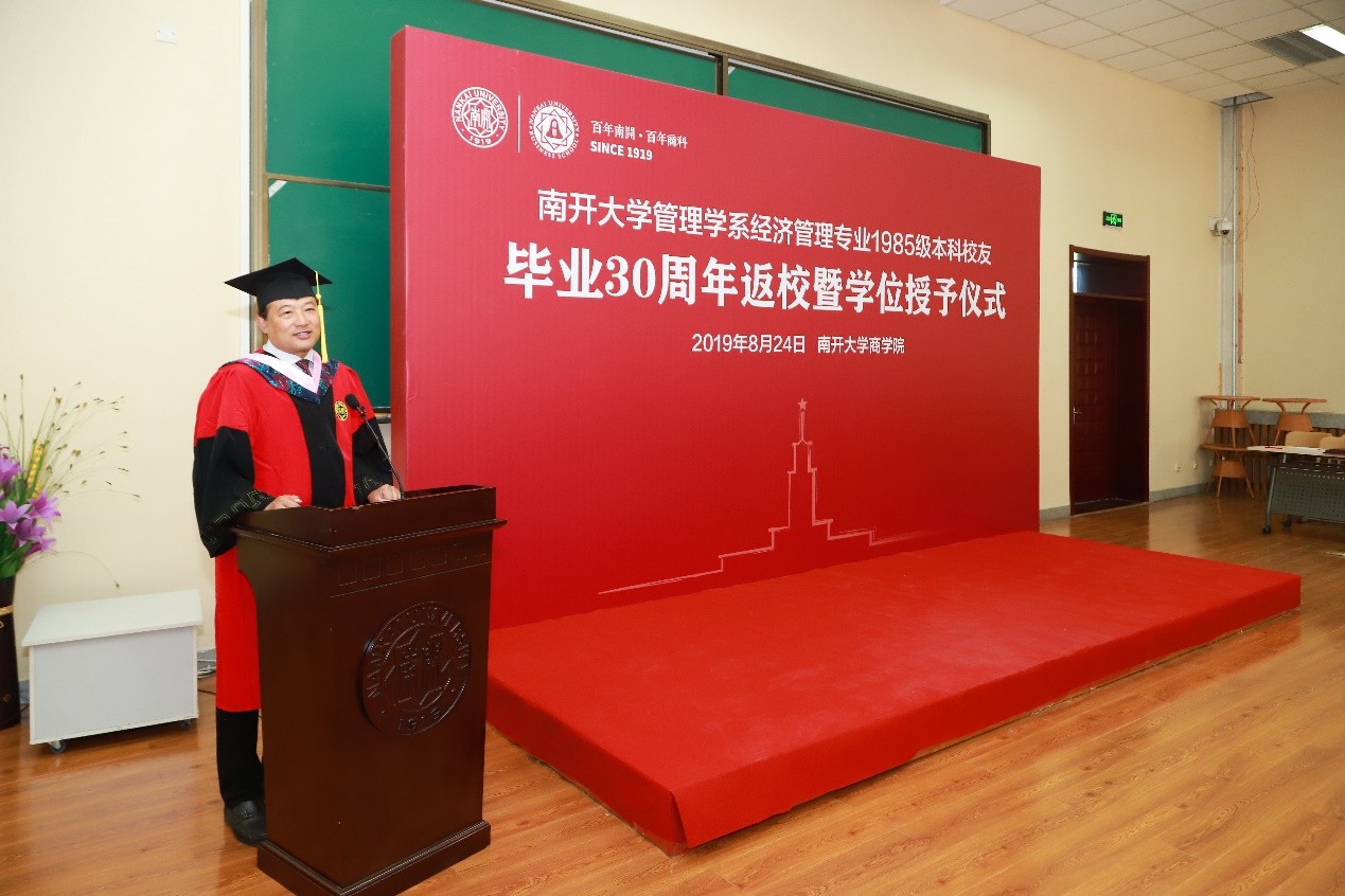 24日上午8点,随着庄严校歌的唱响,第一场活动---补办学位授予仪式正式开始。WilliamHill中文官方网站院长白长虹教授、副院长张继勋教授出席典礼,并为校友颁发本科学位证书。白长虹院长发表了热情洋溢的讲话,并作为师兄勉励学弟学妹们不忘南开初心,牢记肩负使命,允公允能,在各行各业为国家和母校做出更大贡献。校友代表陈立北也代表校友致辞,感谢母校的培养,不负前辈们的期望。忆往昔青葱岁月,看今朝沧桑秋实,当校友打开证书,看到当年自己填写的学生注册卡时,激动的心情无以言表。