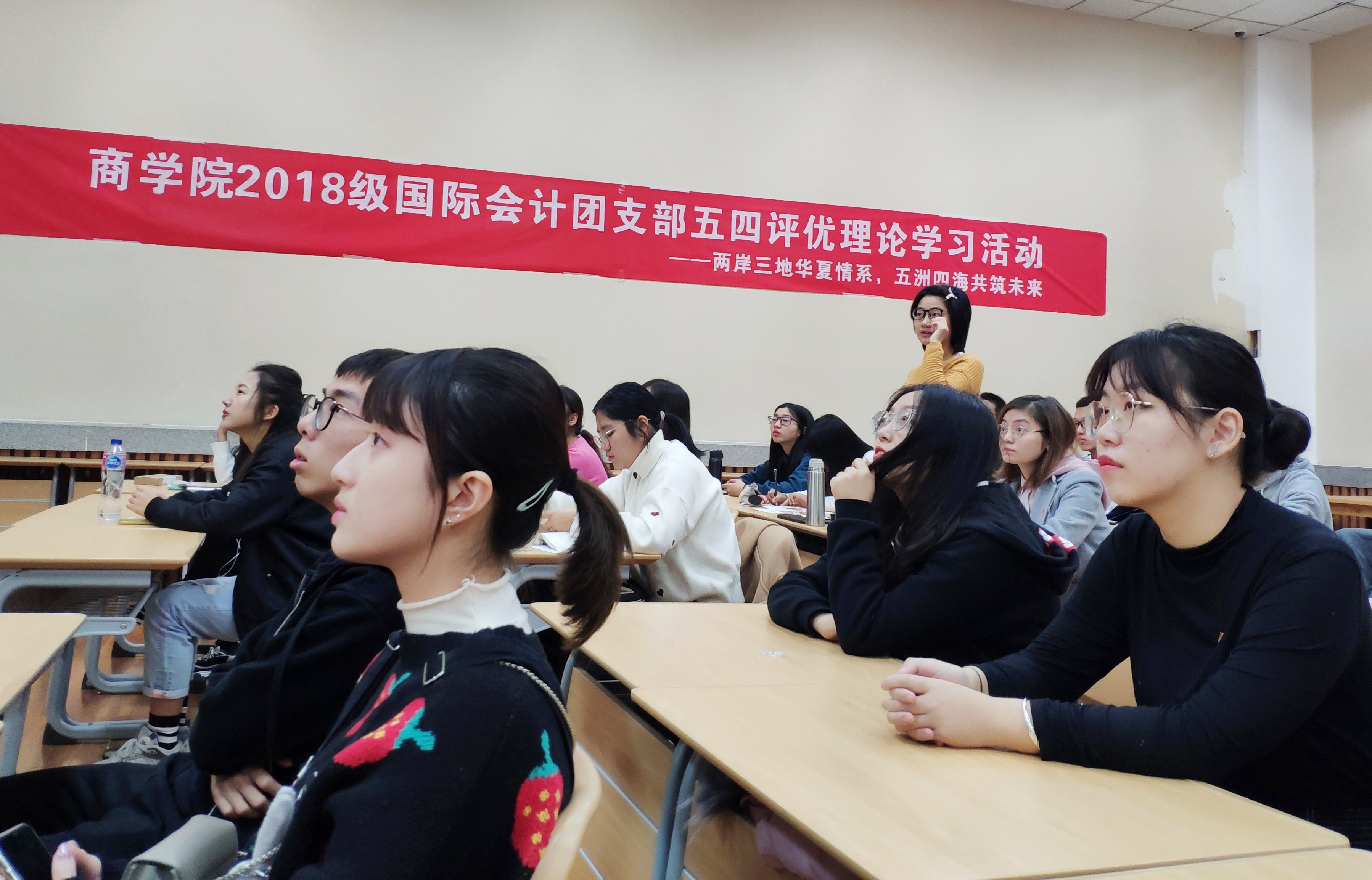 2018级国际会计团支部针对《决定》中“坚持和完善“一国两制”制度体系,推进祖国和平统一”的主题进行了充分的活动设计和学习。学习环节设计研读习近平总书记对民族大团结的重要论述、港澳台和留学生分享、青年学长代表分享、诗朗诵《乡愁》、港澳台小知识竞答、许愿纸祝福环节,让此次支部理论学习活动,有高度又有温度,让支部成员切实感受到“两岸三地华夏情系一起”,“五洲四海”可以共筑未来。