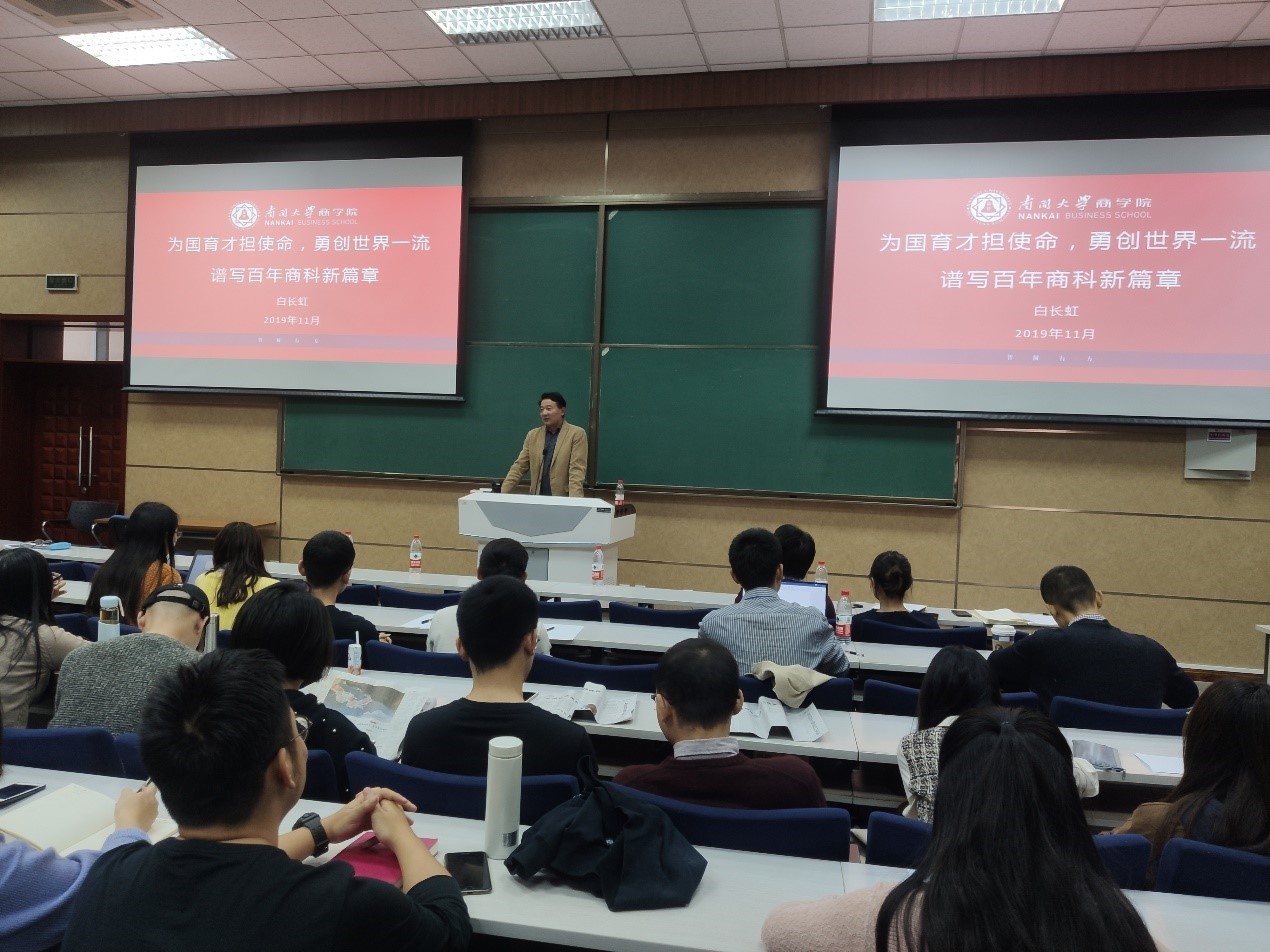 (通讯员 毕媛)根据“不忘初心、牢记使命”主题教育的工作部署,11月11日下午,william威廉中文官网院长白长虹教授,在william威廉中文官网B802,以“为国育才担使命,勇创世界一流,谱写百年商科新篇章”为主题,讲授了一堂生动精彩的专题党课。william威廉中文官网党委副书记李娜主持报告会,william威廉中文官网各教工学生党员代表参会学习。