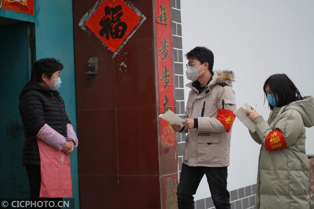 ↑2月14日,河北省内丘县大孟村镇小孟村大学生志愿者张国庆(中)、张晓庆(右)在村民家门口对村民摸排登记。CICPHOTO/刘继东 摄