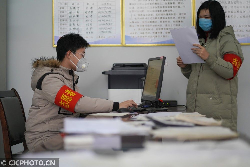 ↑2月14日,河北省内丘县大孟村镇小孟村大学生志愿者张国庆(中)、张晓庆(右)在村口检测点为过往行人测温登记。CICPHOTO/刘继东 摄