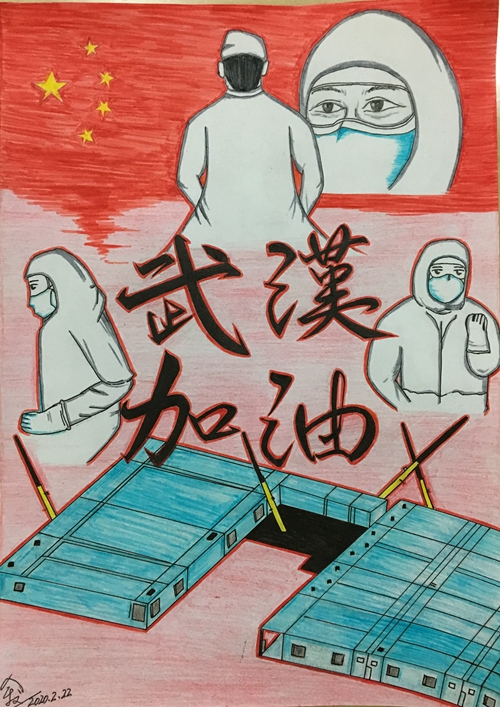 2018级本科生余文锐花费6小时,绘制“武汉加油,中国加油”海报,为团支部开展线上特别主题团日活动进行宣传,鼓励更多青年学生发挥蓬勃朝气,用自身行动共同战“疫”。“与疫情作斗争的不止画中呈现的白衣天使们,还有雷厉风行、抢运物资的解放军战士,生产物资、抢修医院的工人,不顾小我、维持治安的志愿者以及所有注重个人防疫、遵守秩序的我们。而我们有一个共同的名字,叫中国公民。齐心协力同抗疫,武汉加油,中国加油!”余文锐说到。