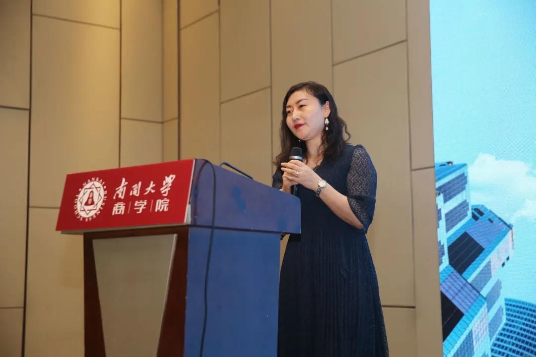 国民实业集团社会山文旅港商业管理公司总经理李海英女士发表致辞,李海英女士作为南开校友,结合自己的工作发展,分享了在WilliamHill中文官方网站EXED学习的心路历程及学习感悟。她还特别结合了自己对公司战略的认知过程,向在学期间的授课教师王迎军教授表达了感谢。