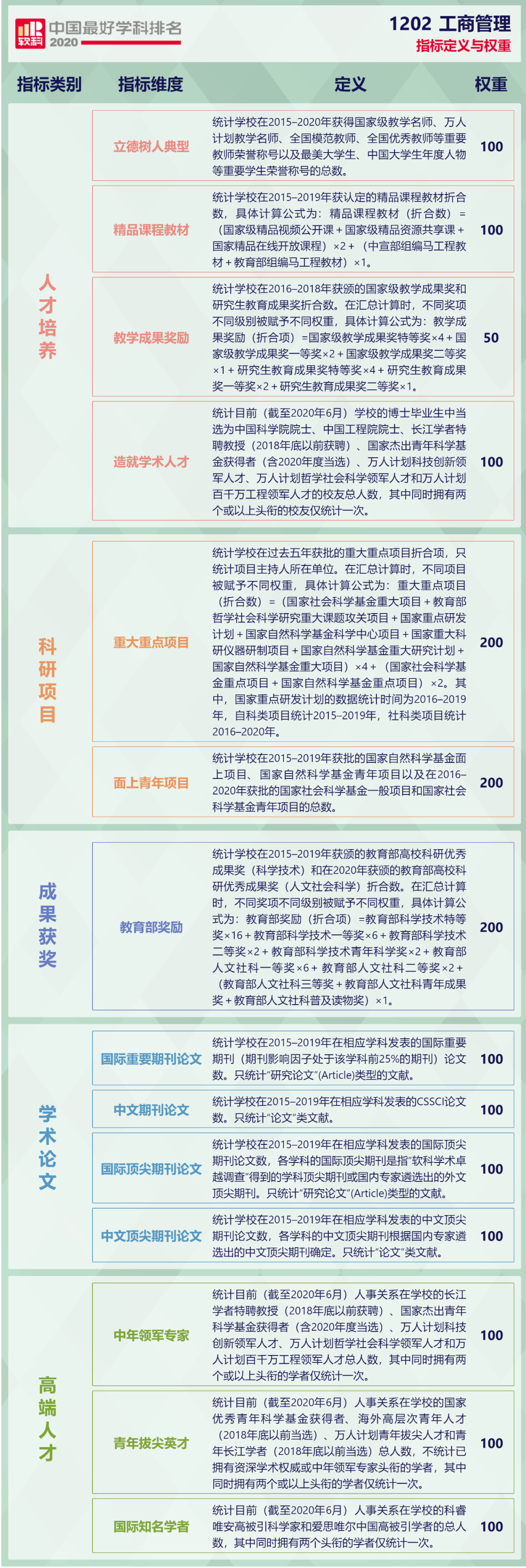 中国最好学科排名的指标体系由人才培养、科研项目、成果获奖、学术论文、高端人才5个指标类别组成,下设16个指标维度,包括50余项测量指标。由于部分指标在不同学科门类的适用性和重要性存在差别,因此中国最好学科排名在不同学科采用差异化的指标体系。工商管理学科的指标定义与权重如下: