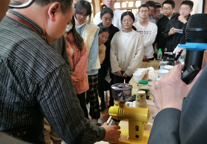 “塞纳河畔,左岸的咖啡”为引,向同学们介绍了成为精品咖啡的条件。合适的气候,用心地种植,经过严格挑选与分级,唯有质地坚硬、口感丰富、风味特佳的咖啡,才算是精品。在专业的烘焙师磨制浓醇咖啡的同时,梁陈为师生细心解读品尝咖啡的步骤:舌尖之甜,舌侧之酸,味蕾之苦。
