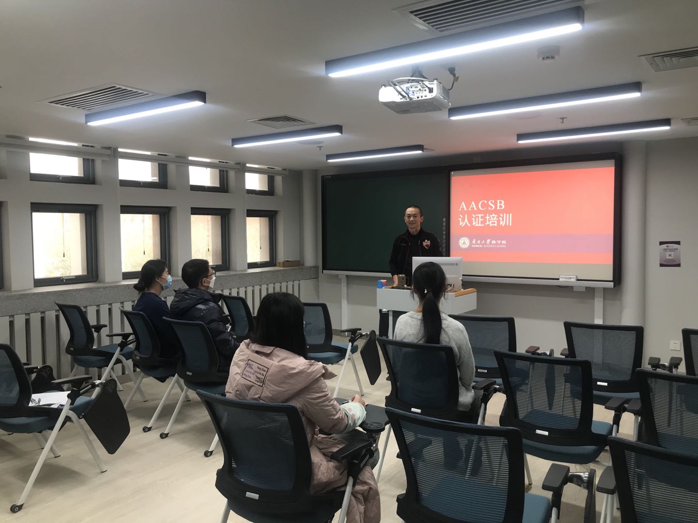 李嵘主任代表学院对新入职教师表示欢迎。崔连广老师从AACSB认证概况、认证的新旧标准、AOL和教师分类等方面为新入职的教职工提供详细的培训和讲解。
