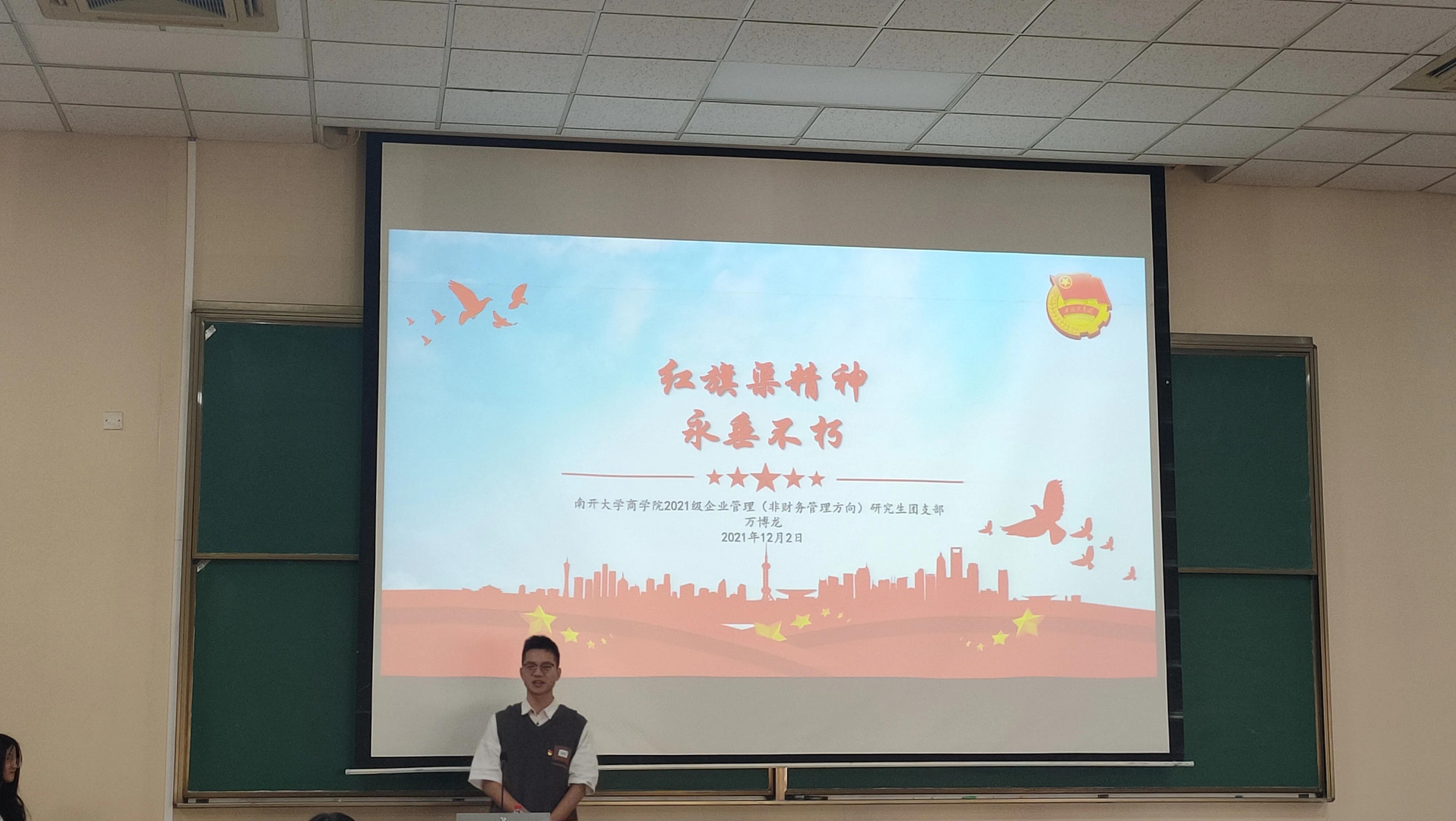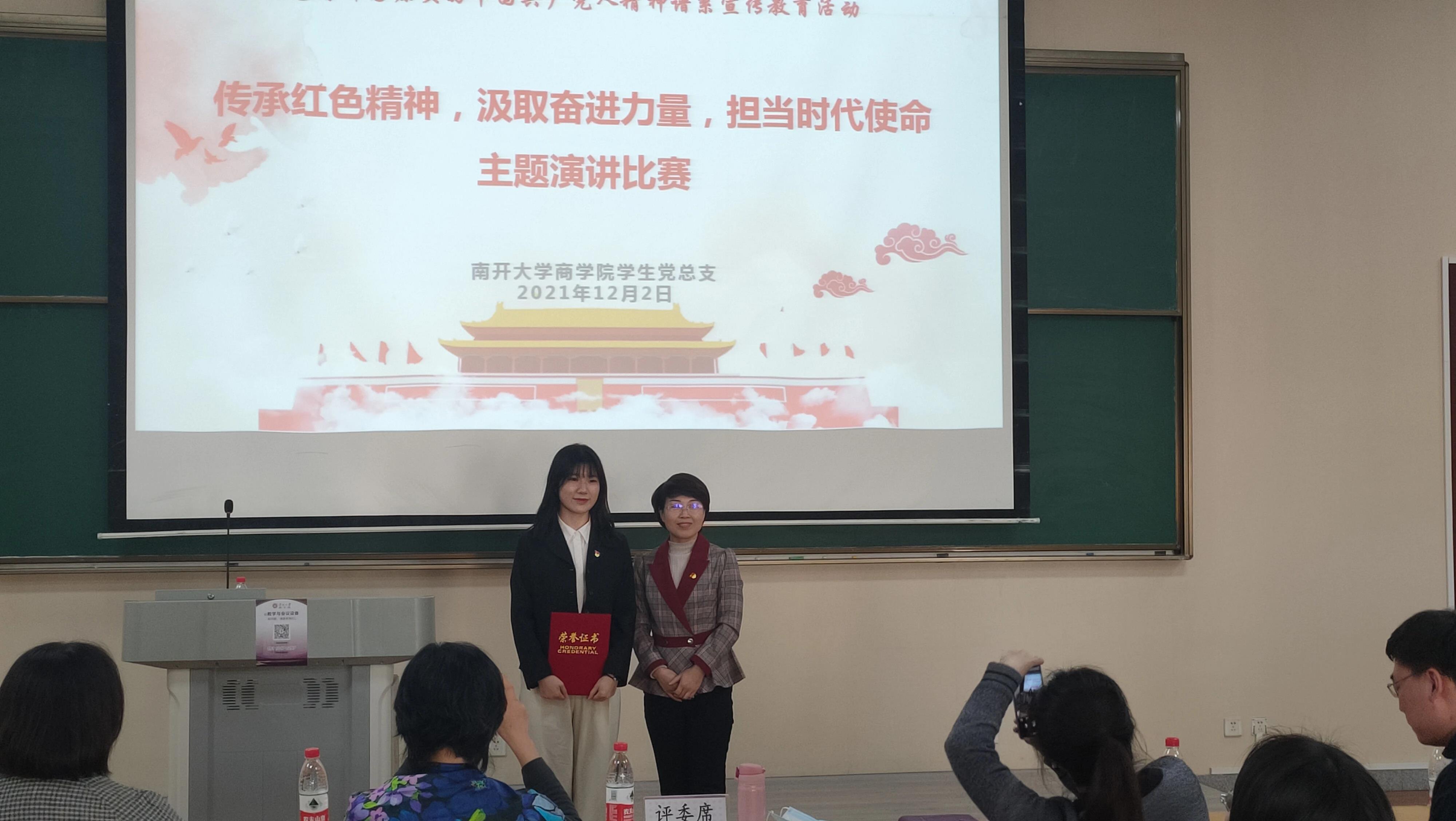 比赛中,参赛同学围绕不同时期背景下的伟大精神展开主题演讲,结合自身学习生活感悟讲述感人至深的时代故事,颂扬了中国共产党百年来走过的光辉历程、取得的伟大成就、凝聚的精神力量、积累的宝贵经验,抒发了对党、对祖国、对人民的热爱,充分表达了新时代南开商课学子学榜样、担使命、立新功的决心和信心,动情激昂地演讲令在场老师同学深受感染。