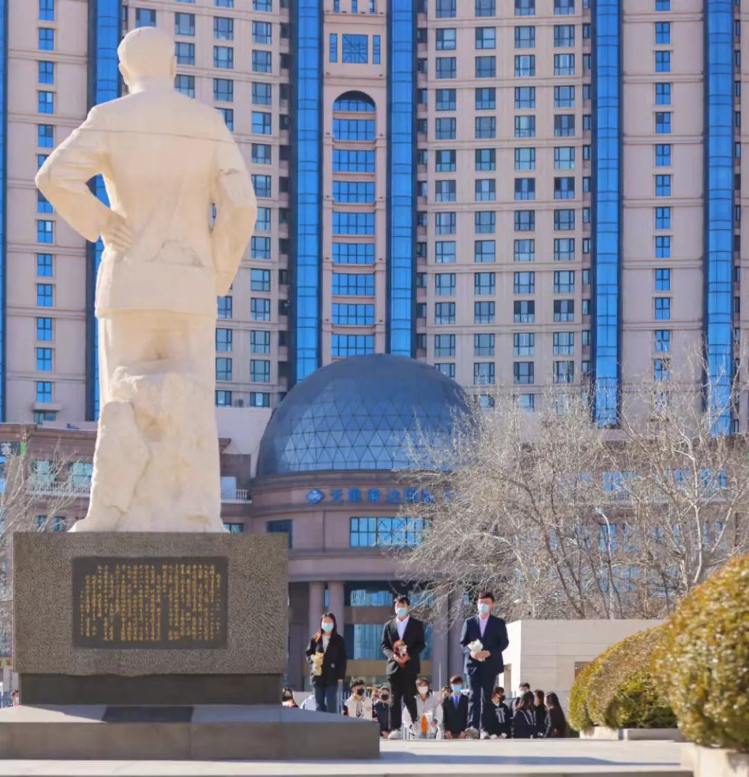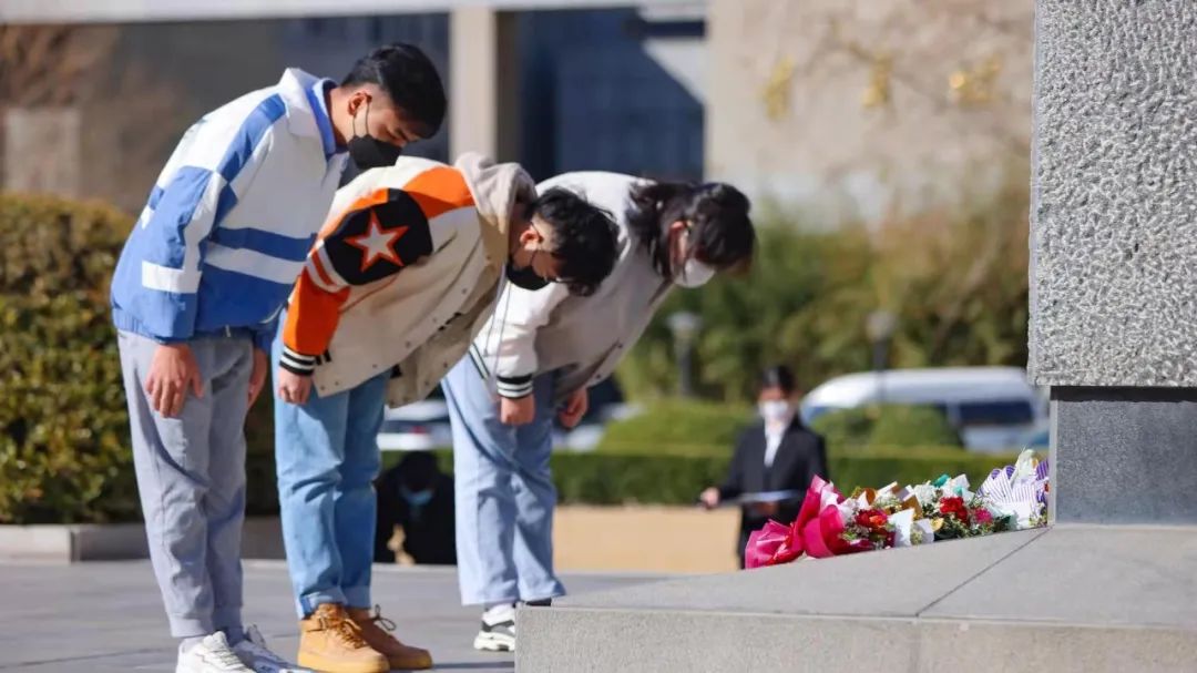 为表达对总理的思念与敬意,在场师生向周总理雕像鞠躬并敬献鲜花。整齐摆放的鲜花与石雕上镌刻的那句“我是爱南开的”相映衬。