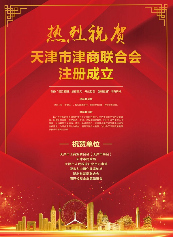 祝贺天津市津商联合会注册成立!津商会正式扬帆起航,广大津商有了共同学习、创新创业、合作奋斗的组织,意义重大、影响深远。津商会的成立,充分体现了天津尊商重才、汇商聚才的坚定决心和鲜明态度,充分体现了广大津商热爱天津、奉献天津的朴素情怀和真挚情感。感谢市委、市政府、市委统战部、市民政局、市工商联和广大津商的信任,我作为首任会长深感责任重大、使命光荣。