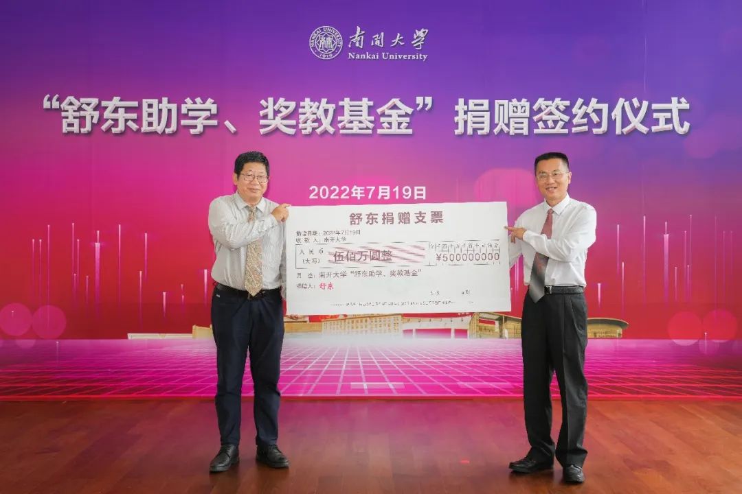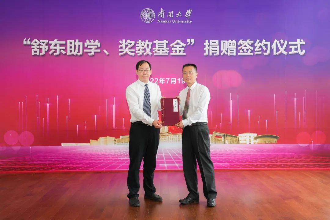 舒东深情回忆了自己在南开读书求学时的美好时光,感念南开师长,特别是当时的辅导员赵金芳老师对自己学习、生活、思想方面的关心关怀和指导。他说,自己的成长得益于母校南开的培育,得益于南开精神的熏陶,得益于恩师的影响,读书时就曾立志将来回馈母校。助学、奖教基金的设立正是母校给予自己感恩回报的机会。希望这一点绵薄之力,能够为有需要的学弟学妹“雪中送炭”,能够给予矢志教书育人的优秀老师一份鼓励,愿母校南开蒸蒸日上,广育栋梁之才。