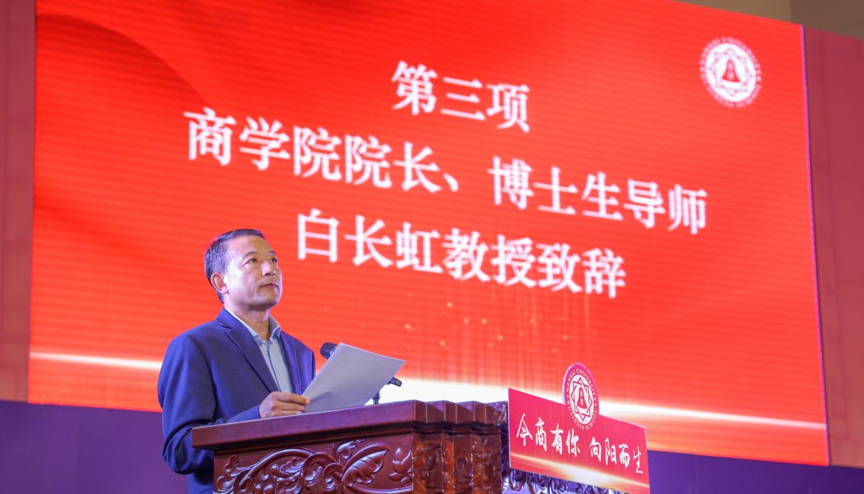 你们选择商科,是因为商科最能表现出大家对美好世界的向往,表达对这个世界的爱。尤其是在科技向善和商业向善的时代,我们通过商业管理智慧去解决社会问题!面对中国的产业升级、新工业革命、乡村振兴、高质量发展、共同富裕、国家统一、民族复兴,人类命运共同体等诸多的新使命、新实践,更加需要同学们刻苦学习、深刻洞察、把握机会、积极应对、砥砺奋进,铸成优势的知识结构与企业家精神。