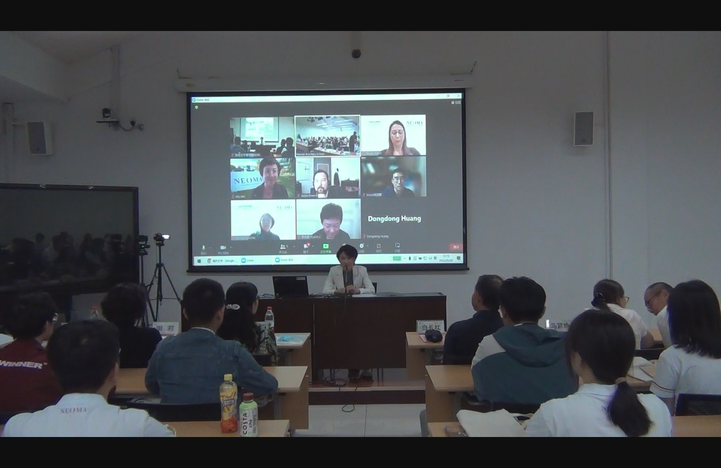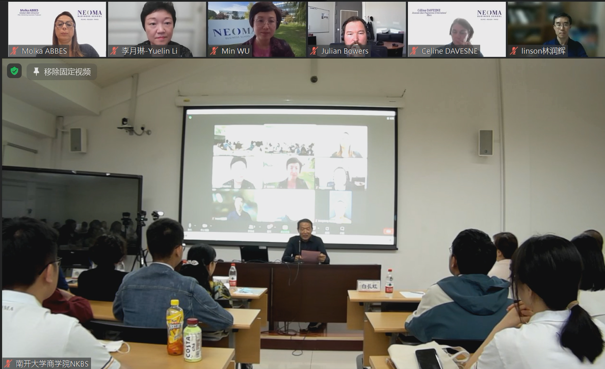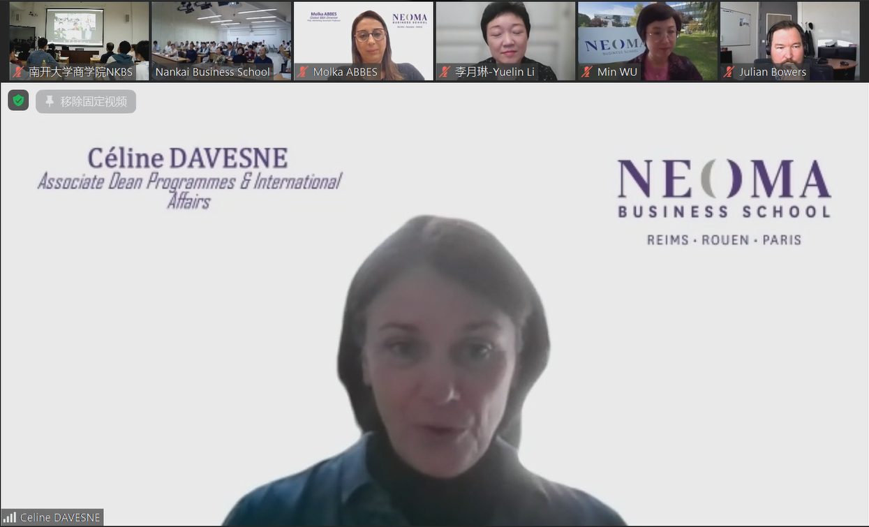 2022年9月29日北京时间18:30,WilliamHill中文官方网站与法国诺欧william威廉中文官网本科合作办学项目2022级新生见面会正式开始。见面会由WilliamHill中文官方网站副院长兼诺欧中法合作办学项目组主任李凯教授主持,WilliamHill中文官方网站国际合作与交流处处长李月琳、诺欧william威廉中文官网副校长Céline Davesne、诺欧william威廉中文官网合作项目主任Molka ABBES、诺欧william威廉中文官网项目专员吴玟、WilliamHill中文官方网站院长白长虹、william威廉中文官网书记孙跃、william威廉中文官网副院长林润辉、william威廉中文官网副院长田莉、william威廉中文官网副书记马丽娇等出席本次见面会。疫情形势下,本次见面会采用线上线下相结合的形式,WilliamHill中文官方网站教师领导和电子商务2022级学生汇聚在校园红磡敬业厅并同步连线法国诺欧william威廉中文官网。