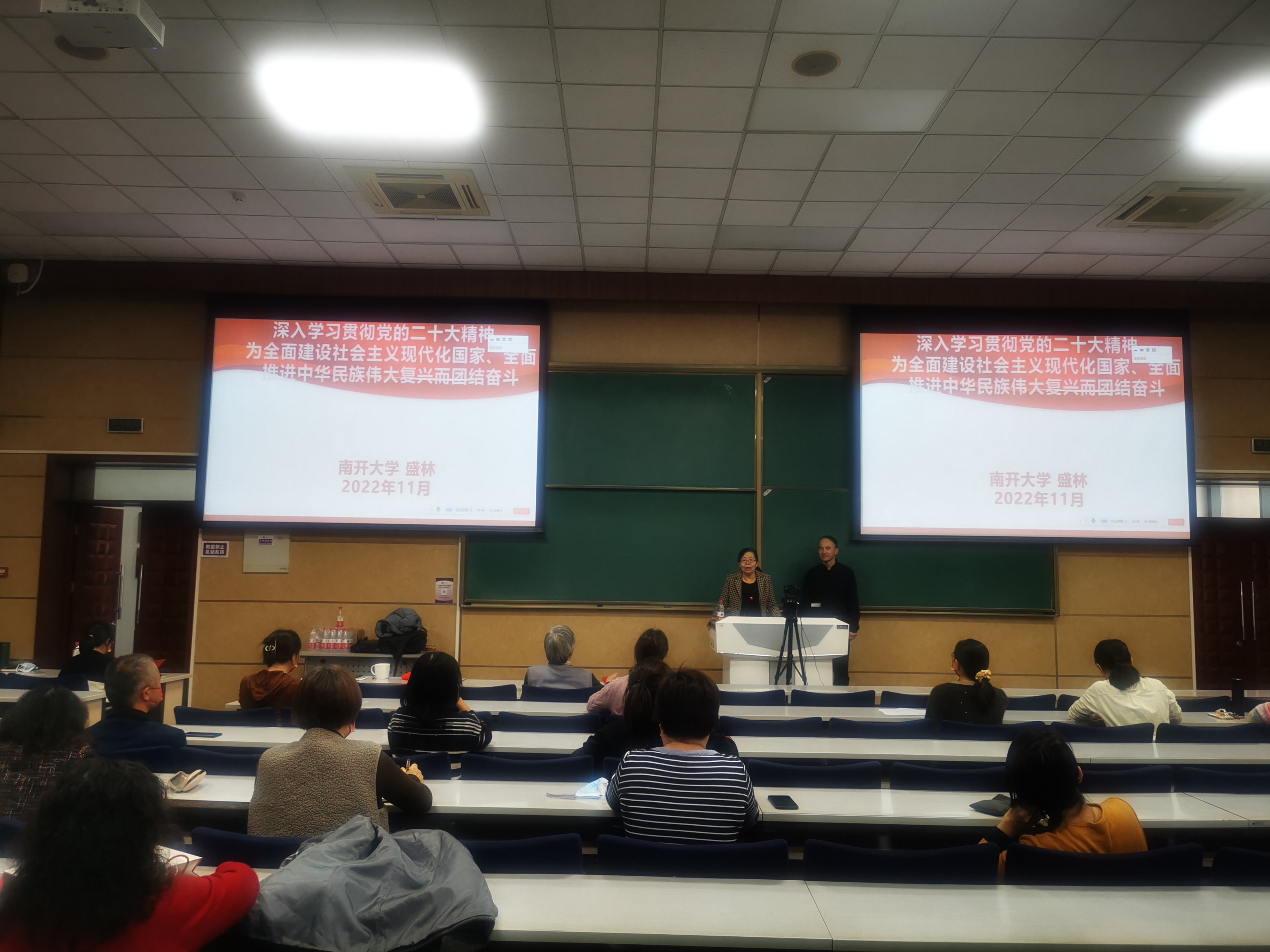盛林教授首先高度肯定了党的二十大是在全党全国各族人民迈上全面建设社会主义现代化国家新征程、向第二个百年奋斗目标进军的关键时刻召开的一次十分重要的大会,是一次高举旗帜、凝聚力量、团结奋进的大会,并从“党的二十大召开的重要时代背景”、“党的二十大报告核心内容解读”、“深入学习贯彻党的二十大精神,全面推进中华民族伟大复兴”三个方面进行了提纲挈领、深入浅出的解读,并以习近平总书记在二十大报告的讲话号召大家坚定信心、同心同德,埋头苦干、奋勇前进,为全面建设社会主义现代化国家、全面推进中华民族伟大复兴而团结奋斗。