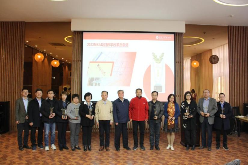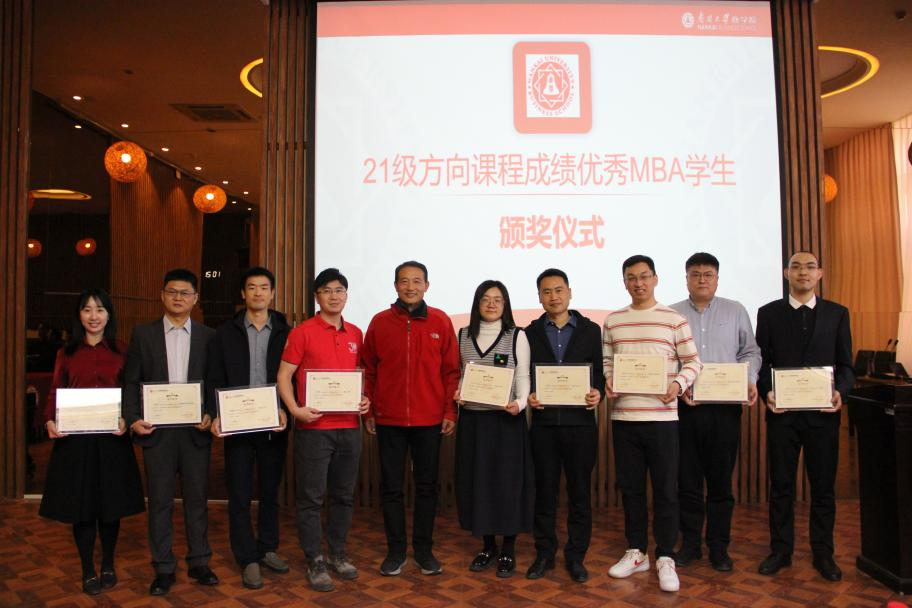 随后的环节,白院长为21 级成绩优秀的 MBA 同学颁奖并合影留念。21级MBA 学生代表、中国移动天津公司的徐晨同学就新开课程分享了学习心得。