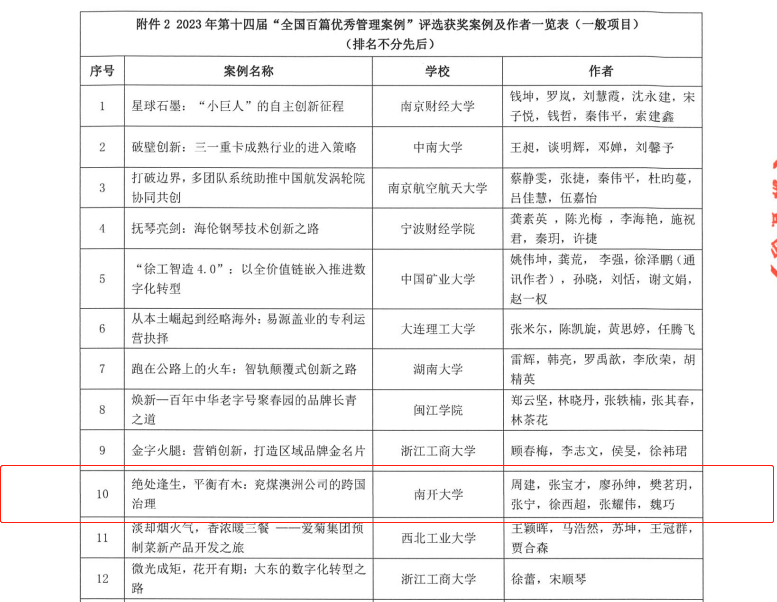 周建教授及其研究团队开发的《绝处逢生,平衡有木:兖煤澳洲公司的跨国治理》(作者:周建,张宝才,廖孙绅,樊茗玥,张宁,徐西超,张耀伟,魏巧),入选第十四届“全国百篇优秀管理案例(一般项目)”。该案例以兖煤澳洲公司的跨国治理为切入点,描述了兖煤澳洲公司在澳大利亚深耕煤炭市场的发展历程,揭示兖煤澳洲公司在“走出去”过程中曾经出现的困境以及相应的应对策略,重点阐述为什么要设计与众不同的跨国治理模式及其是如何发挥作用的,从而最终实现两地上市。本案例旨在帮助学生更好地学习《公司治理》和《战略管理》课程,对于我国国有企业进行跨国治理具有显著的参考借鉴价值。
