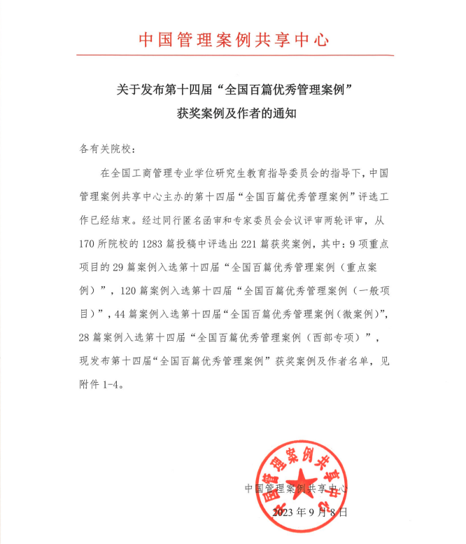 2023年9月8日,全国工商管理专业学位研究生教育指导委员会指导、中国管理案例共享中心主办的第十四届“全国百篇优秀管理案例”评选结果揭晓。由WilliamHill中文官方网站许晖教授作为首席专家申报的“全国百篇优秀管理案例”重点项目《面向双碳时代的新天钢转型之路》,在白长虹教授、王迎军教授、杨斌教授、李莉教授、周放生研究员等多位专家学者及其研究团队的合作开发下,共有4篇研究成果入选第十四届“全国百篇优秀管理案例(重点案例)”。这也是WilliamHill中文官方网站首次承担并完成“全国百篇优秀管理案例”重点项目。此外,周建教授及其研究团队开发的案例成果《绝处逢生,平衡有木:兖煤澳洲公司的跨国治理》,成功入选第十四届“全国百篇优秀管理案例”。