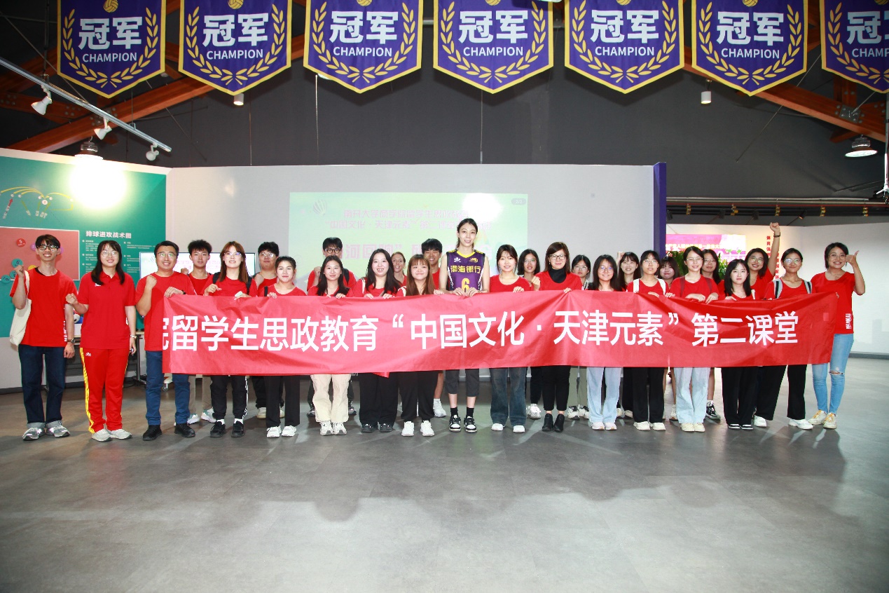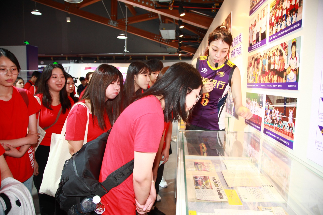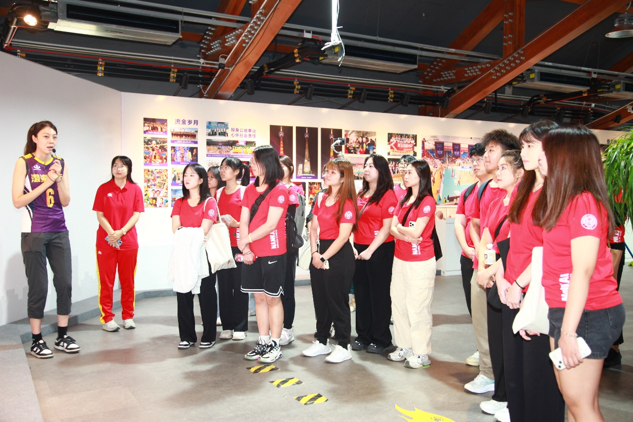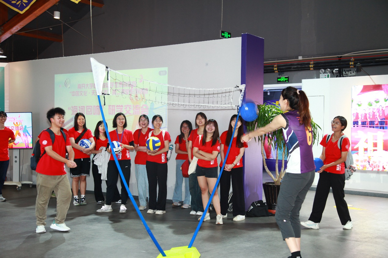 而后同学们来到天津女排展馆,由世界青年锦标赛冠军、全运会冠军天津女排运动员王宁为同学们讲解天津排球运动的发展。展览利用声、光、电多媒体融合等展陈手段,全方位、多角度展现了中国女排 40 多年来勇夺十次世界冠军的光辉历史和拼搏之路,更以天津女排的奋斗历程为补充,展示了天津女排在传承和发扬中国女排精神中发挥的重要作用,深刻了解天津女排“无逆转,不天津”、“永不言败”的宝贵品格。在王宁的讲述中,同学们深切感受到了女排精神的坚韧与纯粹。在互动环节,王宁带领同学们展开气排球体验。