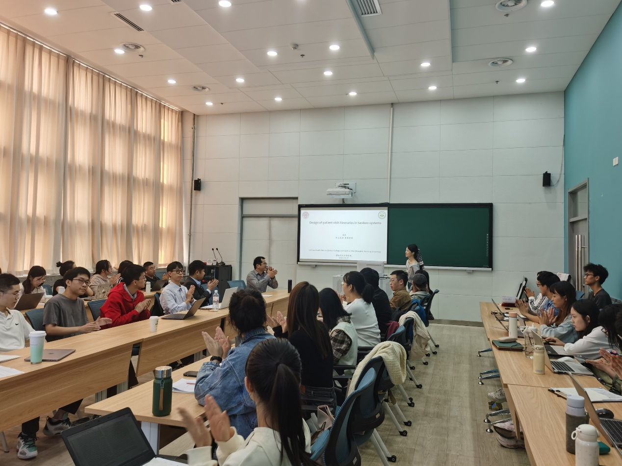 本次讲座中,王杉老师介绍了她的一项最新研究,该研究分析了如何对串联服务系统中顾客的一次完整访问流程进行更好的时间安排。这一问题最大的难点在于,由于该服务系统中不同阶段之间的相互依赖,使得所构建的数学优化模型失去了通常用于求解经典单阶段模型的良好属性。为了应对这些挑战,他们提出了两种求解方案:一个是直接适用于现成的优化软件;另一个是在多面体上的凹最小化问题,它具备整齐的结构特性,在此基础上可开发有效的求解算法。除了这些精确的求解方法,他们还提出了一种近似方法。最后,他们还基于Dana-Farber Cancer Institute的实际数据进行了案例分析,发现他们所提出的方法平均可将成本降低27%。王杉老师的讲座引发了现场同学们的浓厚兴趣,现场交流十分热烈。