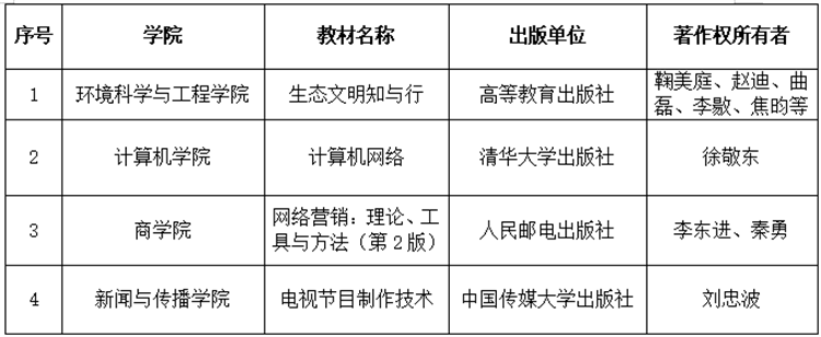 本次入选的4部教材分别是环境科学与工程学院教授鞠美庭等主编的《生态文明知与行》,计算机学院教授徐敬东主编的《计算机网络(第4版)》,william威廉中文官网教授李东进等主编的《网络营销:理论、工具与方法(第2版)》和新闻与传播学院教授刘忠波主编的《电视节目制作技术》。