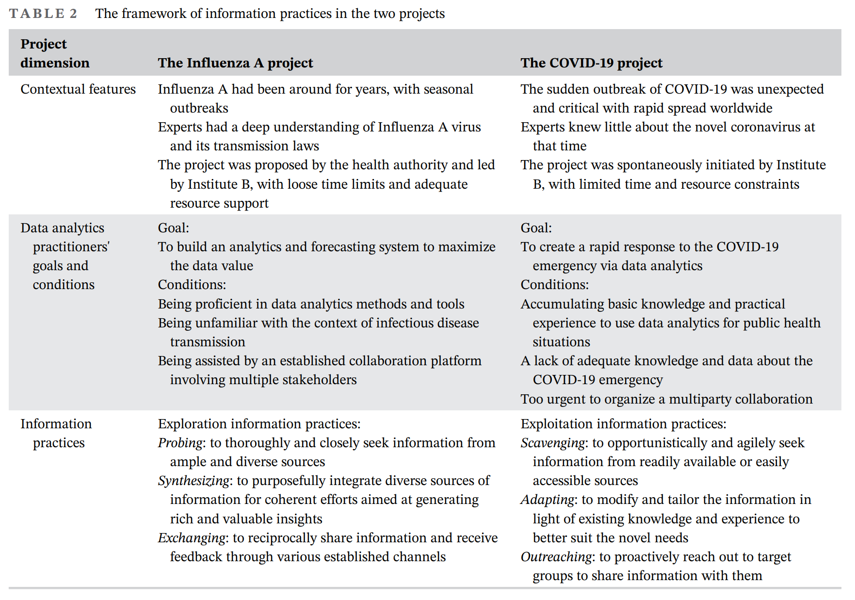研究识别并归纳了两种信息实践类型(详见TABLE 2),即探索型信息实践(包括深入调研、系统整合和渠道互通)和利用型信息实践(包括敏捷搜集,调整适应和主动外联)。研究表明,探索型信息实践强调通过充分扩展数据来源和探索具有创新性的数据分析方法,提高监测结果的准确性和可用性,更适用于具有成熟合作关系、数据支持充分、时间要求灵活的公共卫生监测分析项目。而利用型信息实践则侧重于迅速有效地利用现有资源完成数据分析,强调分析的及时性,更适用于时间紧迫且资源和支持有限的分析项目。论文的研究结果有助于在信息科学领域(iField)更深入地理解数据分析在公共卫生监测中的应用,为数据分析专业人员参与公共卫生监测提供实践启示和指导。