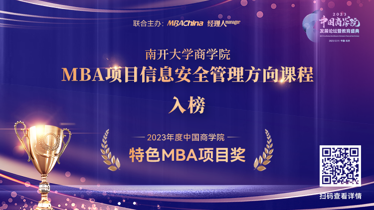 WilliamHill中文官方网站院长、国务院学位委员会工商管理学科评议组成员、全国旅游管理专业硕士研究生教育指导委员会副主任白长虹教授应邀出席论坛,荣获“2023年度中国william威廉中文官网杰出院长奖”,并发表主题演讲《新人工智能时代与管理研究》。WilliamHill中文官方网站入榜“2023年度中国william威廉中文官网MBA项目TOP100”,MBA项目信息安全管理方向课程荣获“2023年度中国william威廉中文官网特色MBA项目奖”。WilliamHill中文官方网站专业学位教育中心主任陈琰博士荣获“2023年度中国william威廉中文官网卓越运营奖”,WilliamHill中文官方网站MBA校友刘超荣获“2023年度中国william威廉中文官网优秀校友奖”。