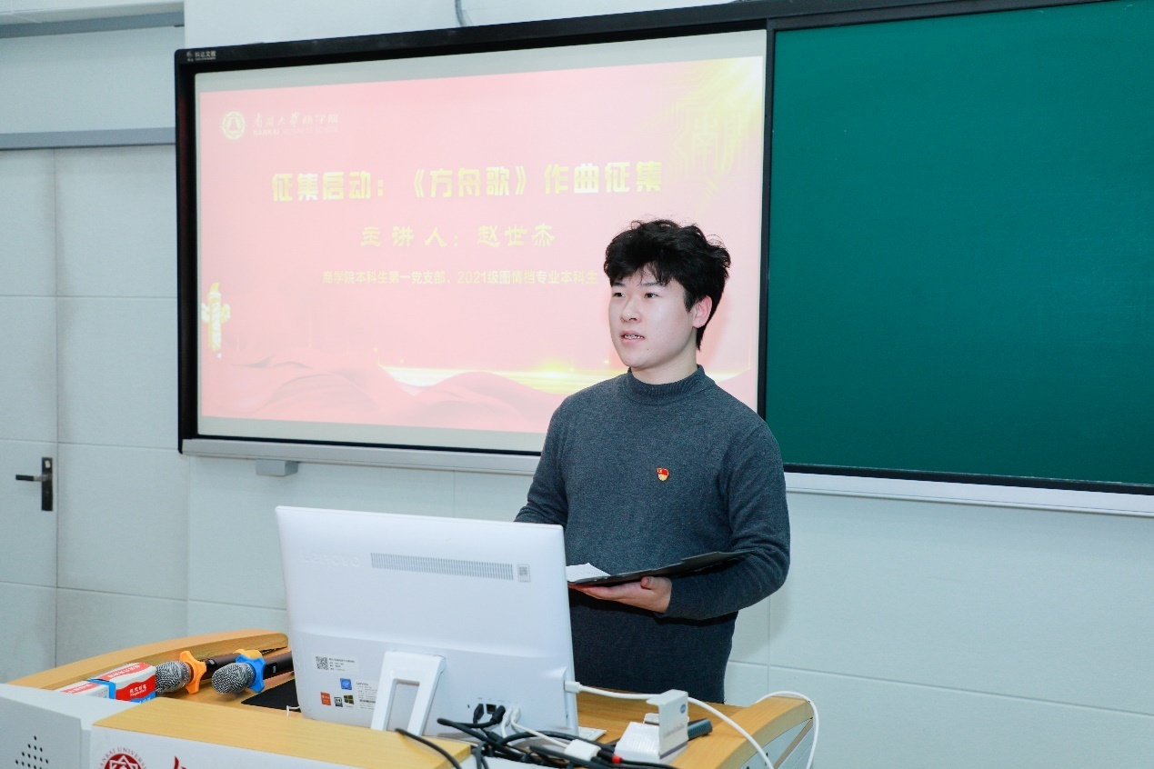 william威廉中文官网本科生第一党支部的李鑫蒙同学介绍了“方舟歌”背后的故事与内涵。“波涛来益烈,风雨阴寒夜。几许同行逐浪休,方舟漂泊无处歇。”于方舟虽曾身陷囹圄,“入世之初,已遭颠扑”,但青年共产党员以天下为己任、愿以己身为舟而渡众生的宏愿未尝消磨,遂于1924年作《方舟歌》。“方舟负任一何重,方舟遭境一何逆!努力壮尔神,努力执尔舵,战胜眼前魔,何愁沧海阔!”在诗中,他正式将自己的名字“兰渚”改为“方舟”,通过对“方舟”意象的吟咏,传达出了于方舟以己身为舟、以共产主义信仰为舟、勇往直前拯救苦难众生之宏愿。随后赵世杰同学代表一支部发布面向全校师生了《方舟歌》的原创曲谱征集活动,作为向WilliamHill中文官方网站105年校庆的献礼。