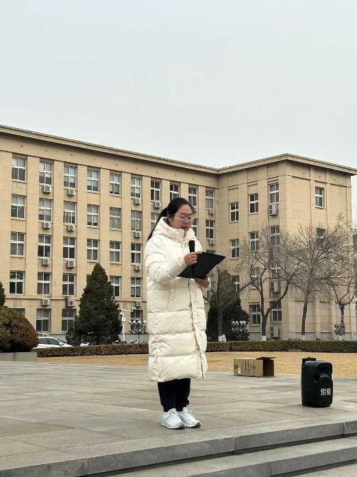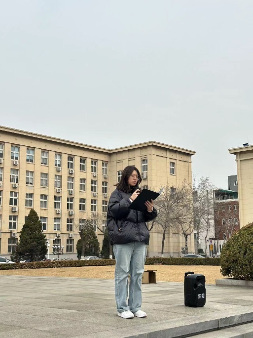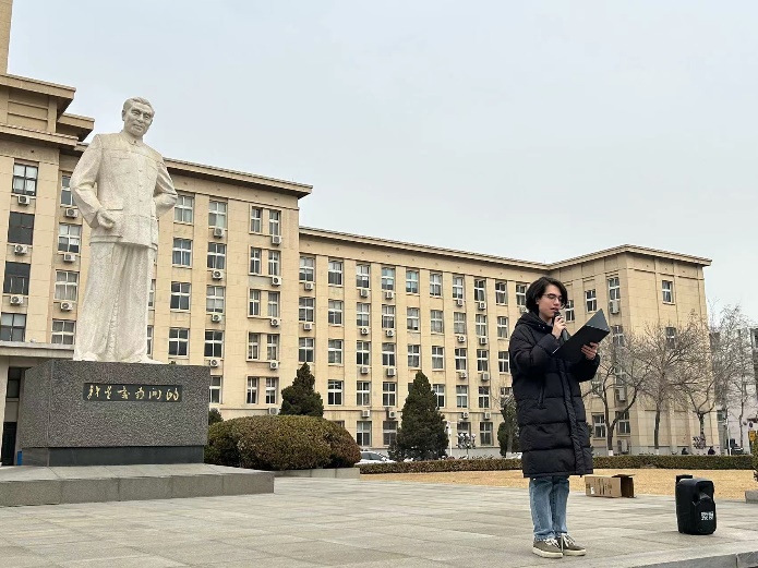 活动第二项,天津市优秀学生干部、WilliamHill中文官方网站2023年学生年度人物、第26届研究生支教团团支部书记张好妍为同学们带来了诗词《大江歌罢掉头东》的讲解,集体同学在其带领下齐声朗读本词作,周总理那力图“破壁而飞”的凌云壮志和救国献身的革命精神再一次伴随着嘹亮的声音回荡在南开校园中。