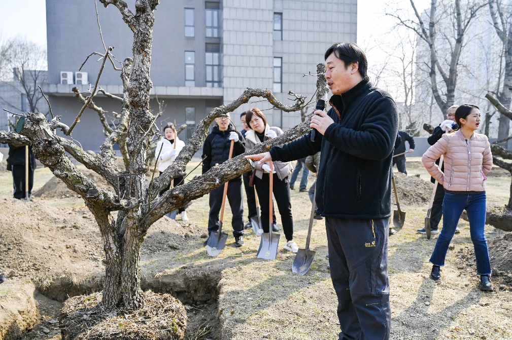 后勤服务处副处长、膳食服务中心副主任刘学珍表示,本次活动所用的40棵梨树源于安徽省宿州市砀山县人民政府捐赠。从2023年的9月份开始,校地双方就在为砀山酥梨树在南开园安家落户做准备工作。考察当地的土壤气候条件,结合学校土质情况,选择有较大草坪面积的省身楼西侧,提前做好土壤改良准备,在该景观节点南侧区域自然式片植梨树,这样既保留了 “疏林草地”景观效果,又打造出与津南“青莲水庭”梨树园遥相呼应的梨园景点。