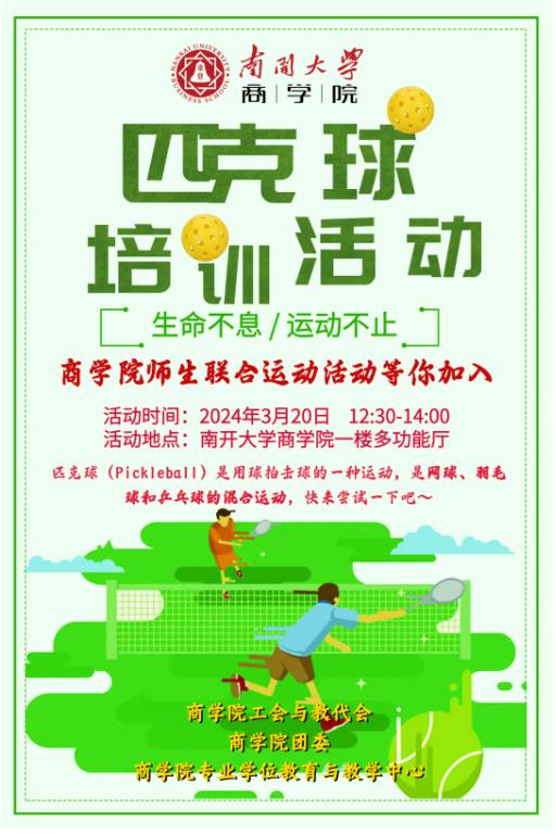 繁忙的校园生活,你是否渴望找到一项运动,既能挥洒汗水,又能释放压力?告别单调,拥抱活力!本周三(3月20日),12:30-14:00,学院一楼多功能厅,一场别开生面的匹克球培训活动等你来战!