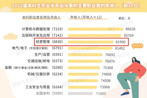 《2023年中国本科生就业报告》(就业蓝皮书)研究发现,从事经营管理相关职业的本科毕业生,其月收入普遍超过本科毕业生平均水平(5990元)(图源:麦可思研究)