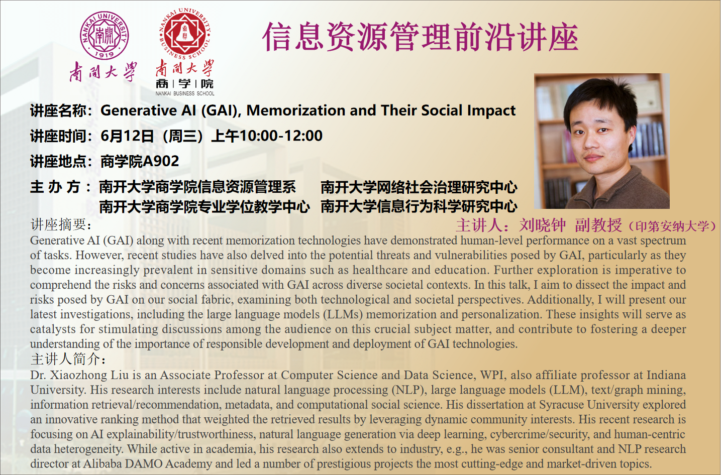 讲座名称:Generative AI (GAI), Memorization and Their Social Impact