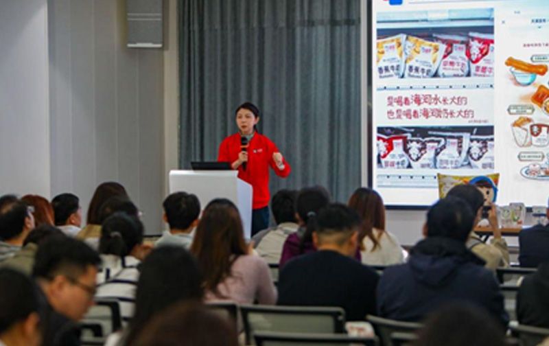在随后的课堂交流中,天津海河乳品有限公司市场部、销售部副部长倪薇介绍了海河乳品的品牌及营销网络、品牌赋能、产品架构及未来规划。海河乳品通过媒体合作、内容传播、品牌声量、联名合作、研学观光、公益活动等形式进行品牌形象打造与宣传,并利用科技和文化赋能品牌,采用“领鲜战略”,致力于成为天津市场乳品领导品牌。