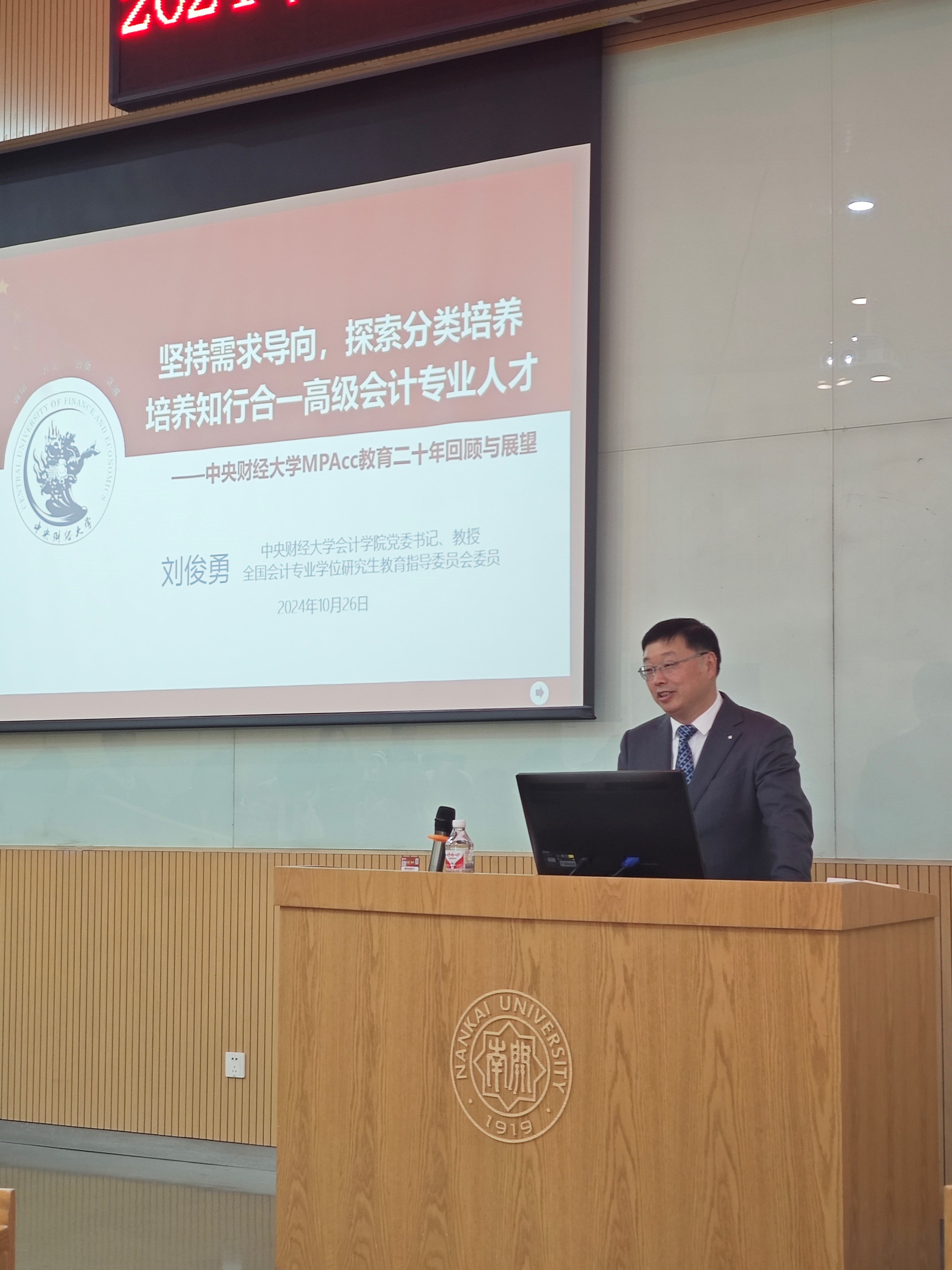 在接下来的主旨演讲阶段,全国会计专业学位研究生教育指导委员会委员、中央财经大学会计学院党委书记刘俊勇教授作题为“守正创新,打造生态化人才培养模式”的主旨演讲。他从中央财经大学20年MPAcc发展历程讲起,历经历史多重变化,在人才培养中按照服务国家战略的根本要求,以“专”“精”“特”“新”为培养目标,加强自主培养,整合实务界人力资源,打造多平台联动机制,提高院校生态式发展。