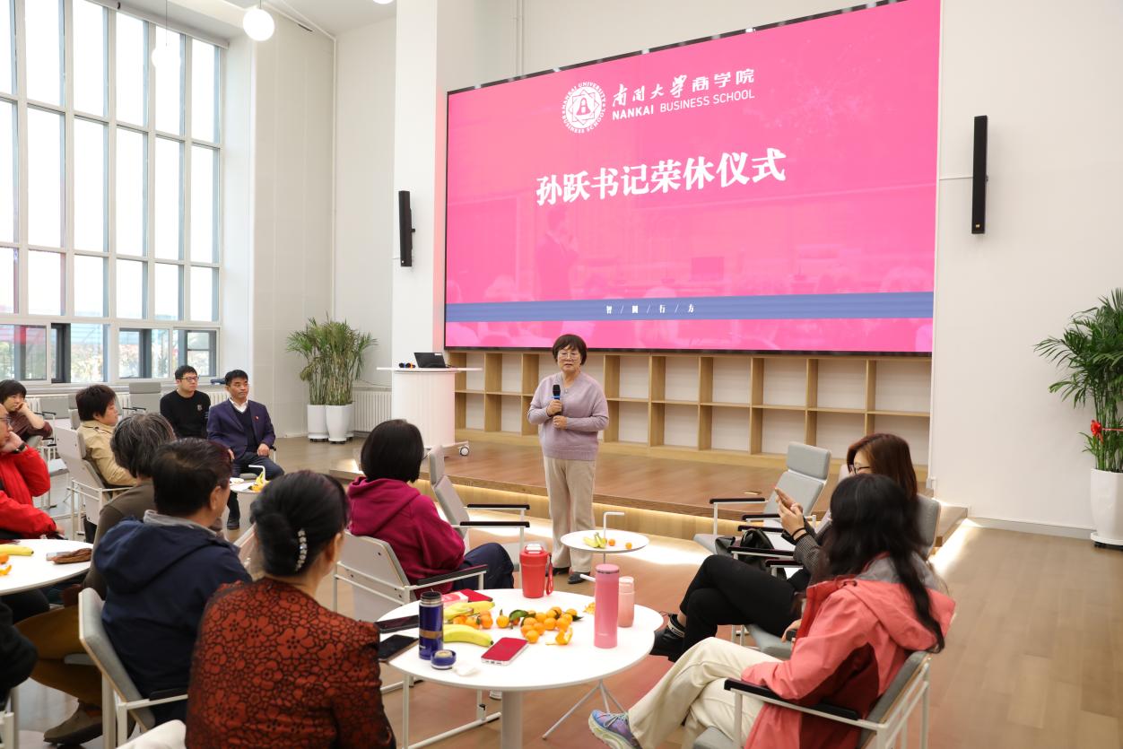 “岁月的笔触轻轻描摹,美好眼前是你温柔的侧脸。”伴随着《星辰紫·南开梦》的歌声,学院为孙跃老师献花并赠送纪念品,与会人员合影留念。参会的青年教工深受感染,纷纷表示将以孙跃老师等前辈为榜样,传承薪火、弦歌不辍,坚守教育初心,认真履职尽责,为推动学校学院高质量发展贡献自身力量。