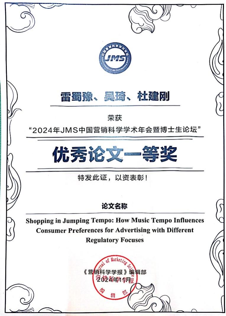 (通讯员 雷蜀豫)2024年10月31日至11月3日,第二十一届JMS中国营销科学学术年会暨博士生论坛在华东师范大学成功举行。WilliamHill中文官方网站市场营销系杜建刚教授带领博士生雷蜀豫和硕士生吴琦,提交的论文《Shopping in Jumping Tempo: How Music Tempo Influences Consumer Preferences for Advertising with Different Regulatory Focuses》荣获“2024年JMS中国营销科学学术年会暨博士生论坛”优秀论文一等奖,以表彰其杰出的学术贡献与创新研究成果。