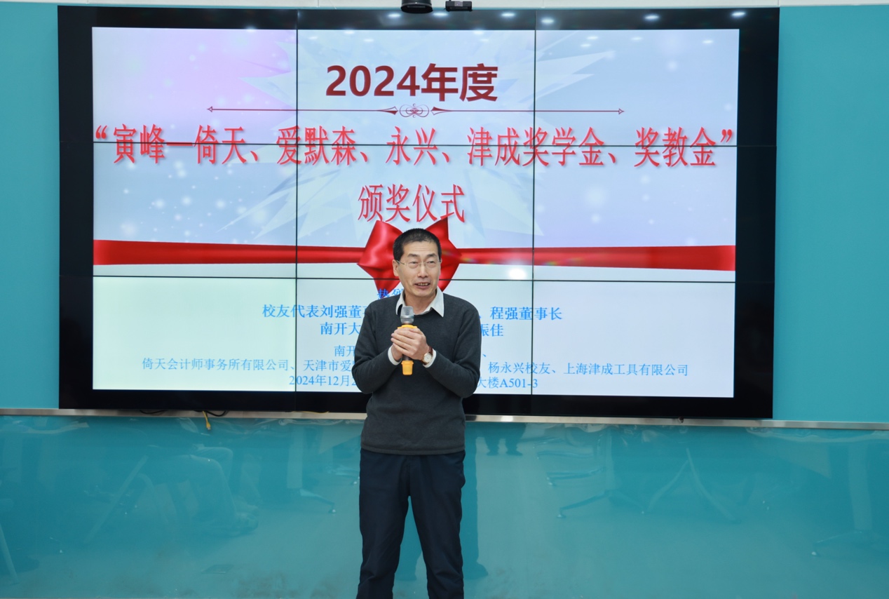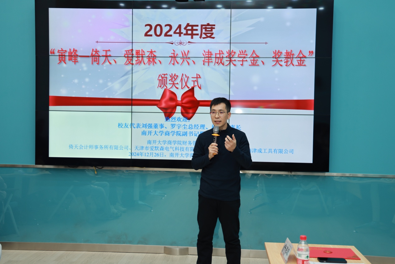 黄福广教授作为获奖教师诚挚地向支持本次奖项的企业家们以及精心组织评奖的评审组委会表达了深深的谢意,他表示“寅峰—倚天、爱默森、永兴、津成基金”在教育领域发挥了显著且积极的作用,在受资助的学生群体中,已经涌现出了许多优秀人才,在学术道路上不断攀登高峰。