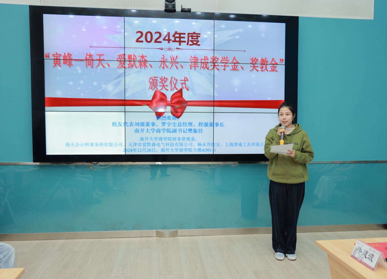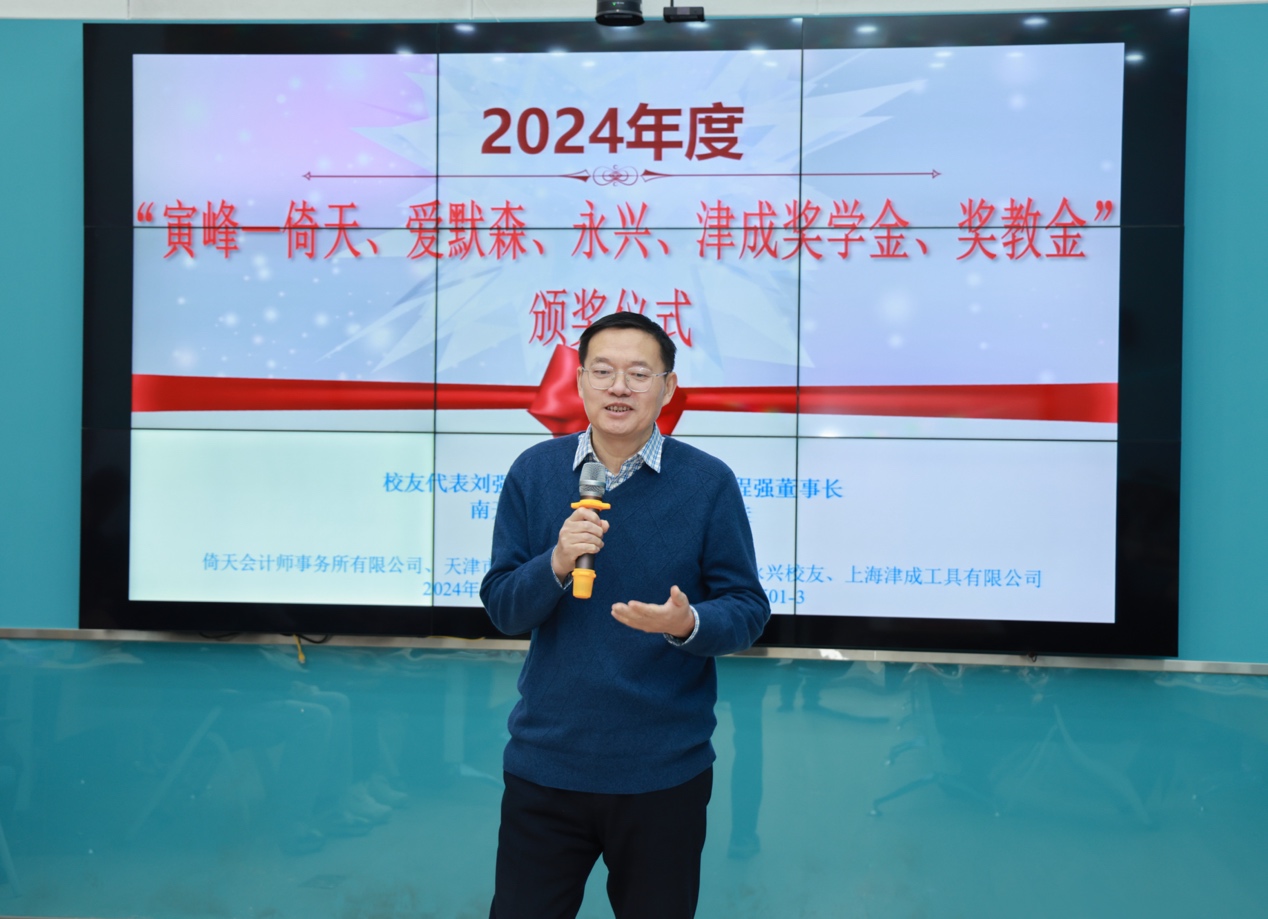 财务管理系副主任齐岳教授热情开场,对长期以来热心捐资助学的校友们致以最诚挚的感谢。这些校友的无私奉献如同明亮的灯塔,持续照亮着财管系学子的求学之路,为培养优秀的财务管理人才奠定了坚实基础,他们的善举已成为财管系发展历程中不可或缺的重要支撑,期待未来能进一步加强合作,共同开创财管系更加灿烂的明天。
