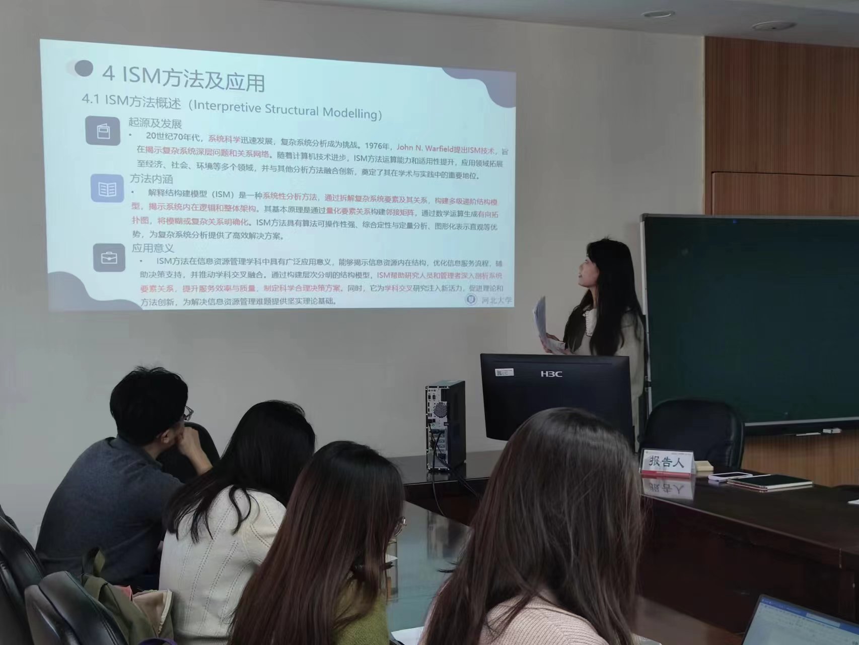河北大学管理学院图书馆学系魏蕊教授以《<信息组织>课程教学与研究:我们的五年》为题,回顾了该课程的发展历程,重点介绍了课程内容的创新与实践。她强调,课程紧密结合文化产业,注重培养学生在信息组织领域的专业能力,学生能够将理论应用到实际中,提升实践能力。同时,课程与研究相结合,推动形成了元数据标准化和数据治理等领域的多项研究成果。她表示,教学与研究的有机结合是课程成功的关键,未来将继续推动该课程的发展,培养更多具有创新和实践能力的人才。