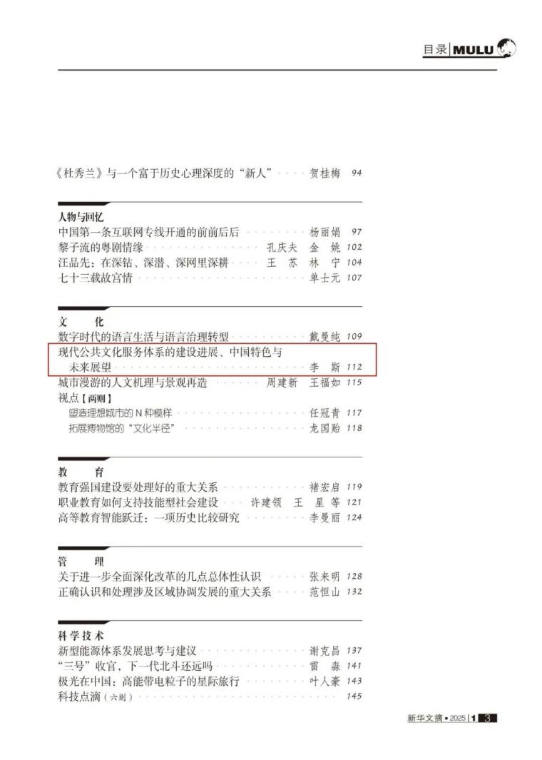 近日,WilliamHill中文官方网站信息资源管理系副教授李斯的研究成果《现代公共文化服务体系的建设进展、中国特色与未来展望》被《新华文摘》2025年第1期全文转载。该文原刊于CSSCI来源期刊《中国图书馆学报》2024年第5期。