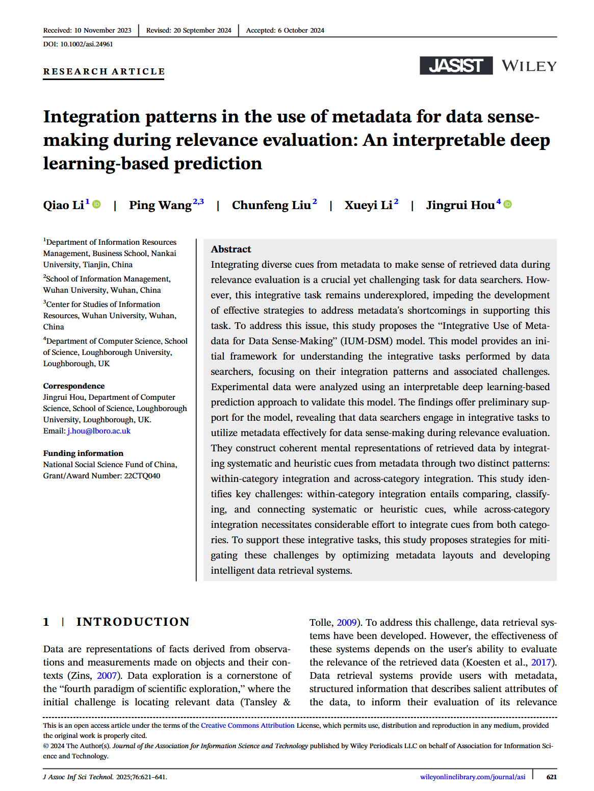 日前,WilliamHill中文官方网站信息资源管理系李樵老师(第一作者)及其科研团队合作的研究论文“Integration patterns in the use of metadata for data sense-making during relevance evaluation: An interpretable deep learning-based prediction” 发表于信息资源管理学科国际顶级期刊Journal of the Association for Information Science and Technology 2025年76卷第3期。